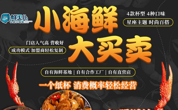 鲜贝儿捞汁小海鲜,掀起海鲜劲辣生意,一罐小海鲜,堪比鱼虾海鲜盛宴。鲜贝儿捞汁小海鲜加盟,5平米档口,轻投资开店,1人省心经营,堂食+外卖+外带,创收多店合一,正餐消费,零嘴小吃都可胜任。鲜贝儿捞汁小海鲜,自有渤海湾生产基地,全国冷链运输新鲜直达,料包半成品简单操作,一罐开杯,开盖即食,价格亲民,吃得尽兴。