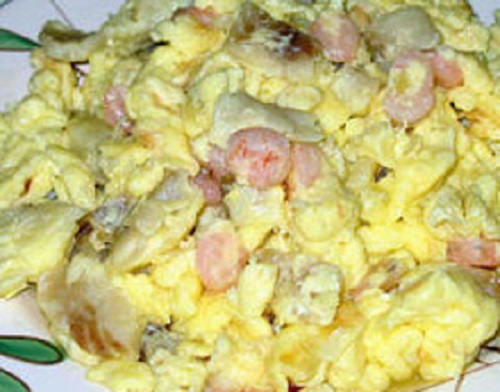 6另用勺下入油烧热,将鱼条、鸡蛋液倒入锅内,拌炒熟后,随下碗芡汁,颠匀,淋人香油即成;