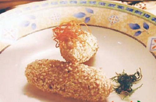 6炒勺放油,烧至七成热,下芝麻鱼卷炸熟,呈金黄色时捞出,控净油分,整齐摆在盘内即成;