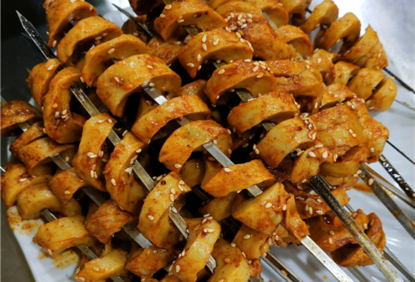 面筋一直以来都是我国传统的素菜食材,但烤面筋却做到了不一样的味道,明明只是用面粉加上酱汁烤制而成的面筋,竟然有着肉的香味,吃在嘴里完全就像是在吃烤肉一样,令人久吃不厌。烤面筋除了可以烤着吃,也可以炸着吃、煮着吃都是非常美味的。一串色泽金黄红亮的烤面筋吃到嘴里油滑松软,麻辣鲜香,味道可与烤肉相媲美。吃后口齿留香,回味悠长,让人难以忘怀!