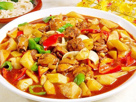 新疆大盘鸡又名为沙湾大盘鸡,是新疆名菜,起源于20世纪80年代后期,主要用料为鸡块和土豆块,配皮带面烹饪而成。色彩鲜艳、爽滑麻辣的鸡肉和软糯甜润的土豆,辣中有香、粗中带细,是餐桌上的佳品。